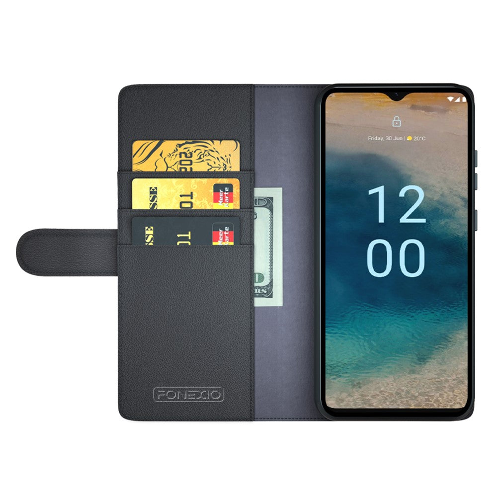 Echtes Lederetui mit Kreditkartenfächern für Nokia G22 - Schwarz