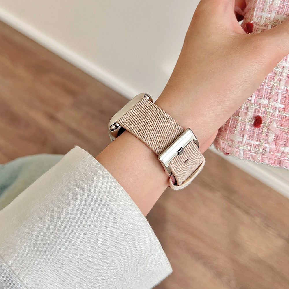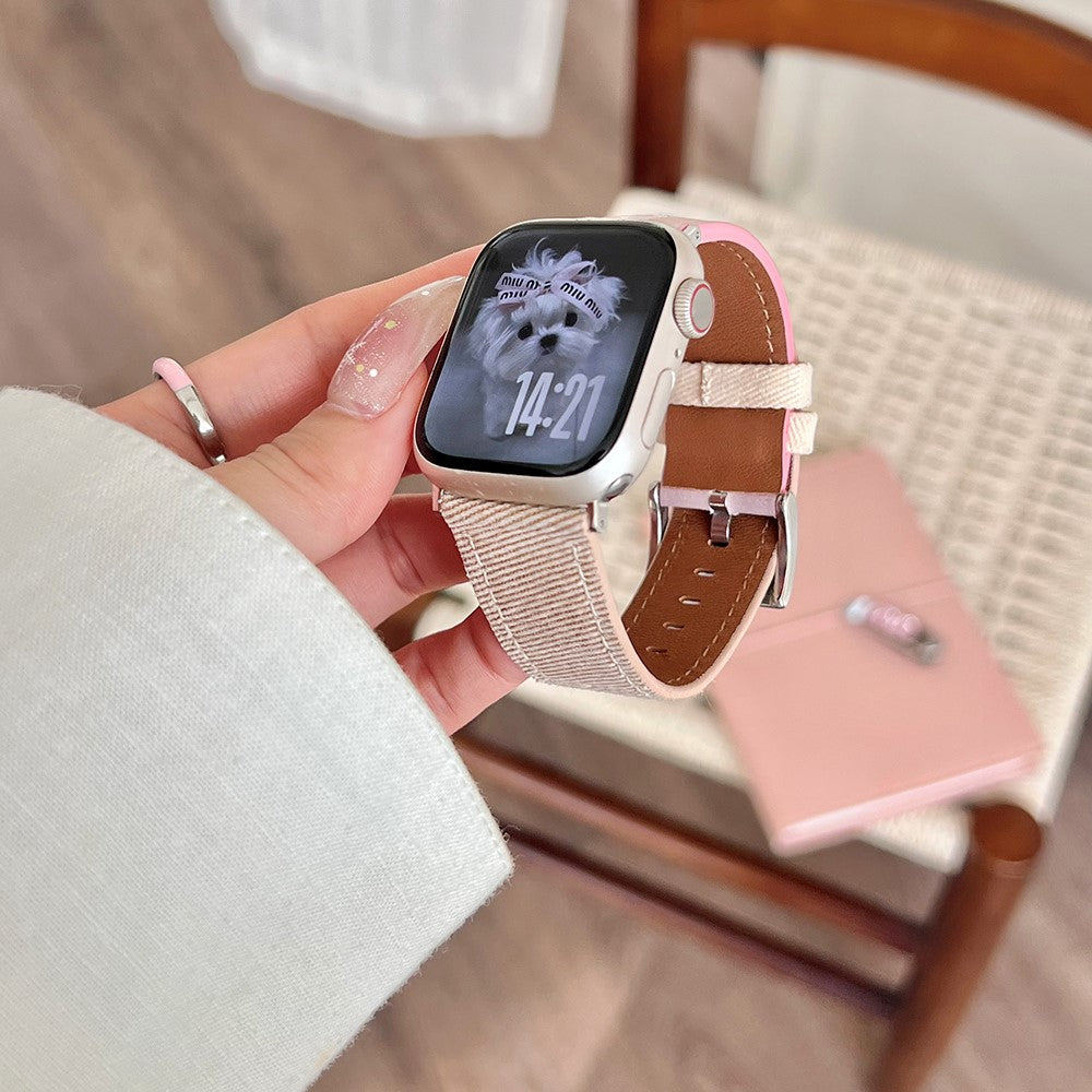 Uhrenarmband Apple Watch Series 10 42mm Besticktes Denim-Lederarmband - Pink / Khaki